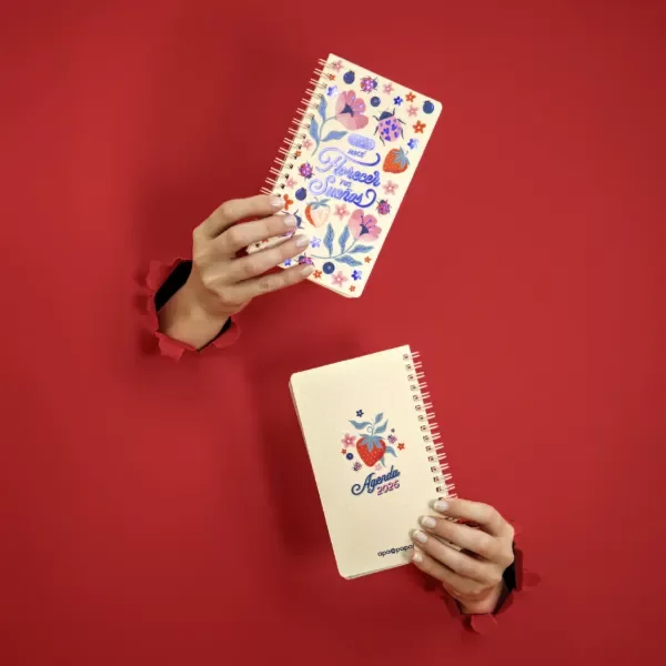 Tapa semi rígida, con terminación en papel texturado mate. Con hot stamping, elástico y anillado a tono de cada diseño.