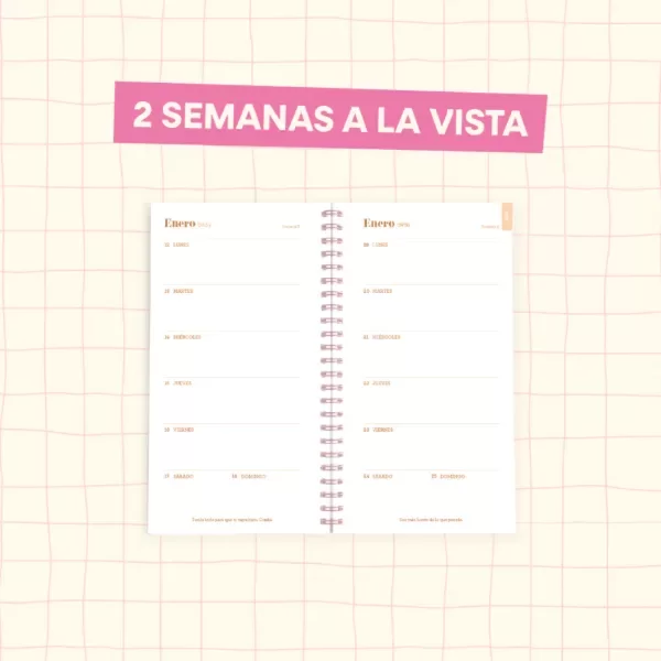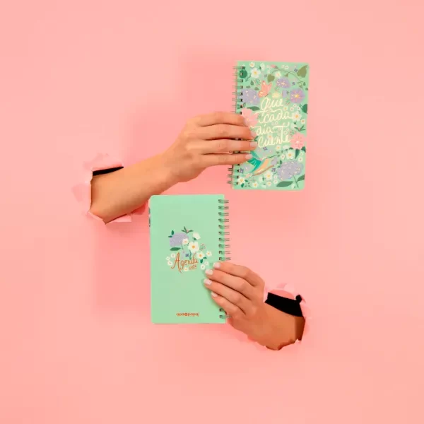 Tapa semi rígida, con terminación en papel texturado mate. Con hot stamping, elástico y anillado a tono de cada diseño.