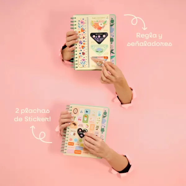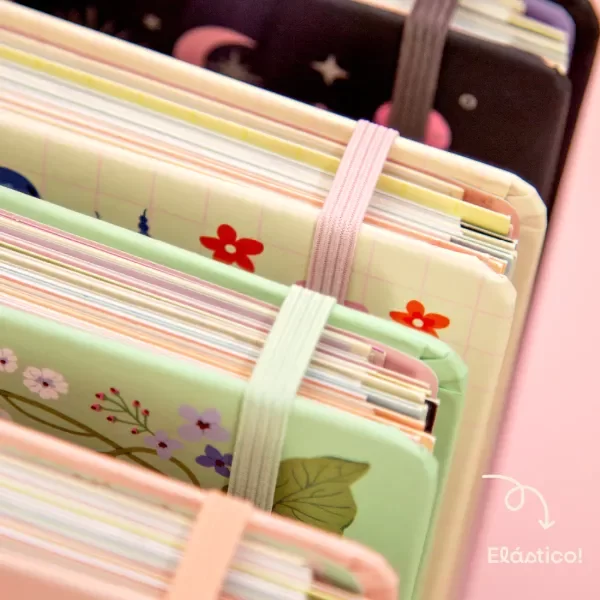 Tapa dura, puntas redondeadas, terminación soft touch mate y hot stamping a tono. Elástico y anillado súper amplio y cómodo de colores!