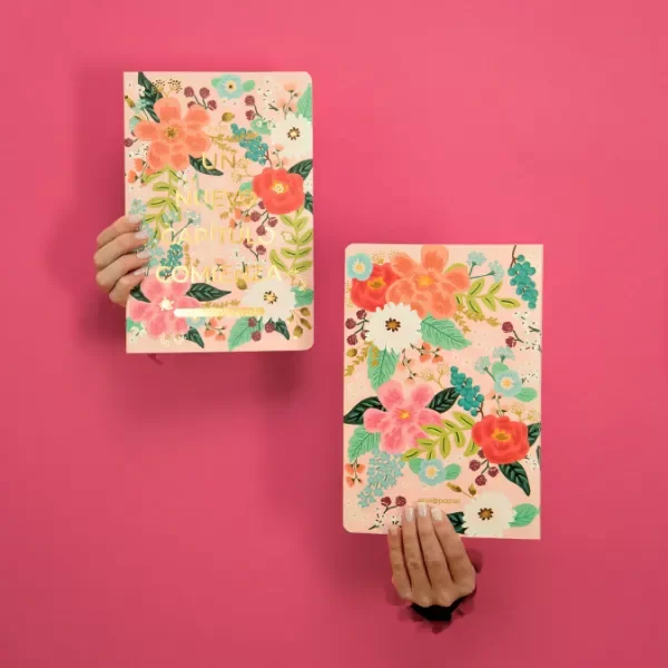 Tapa semi rígida, puntas redondeadas, terminación con papel texturado mate encuadernación cosida, con hot stamping metalizado.